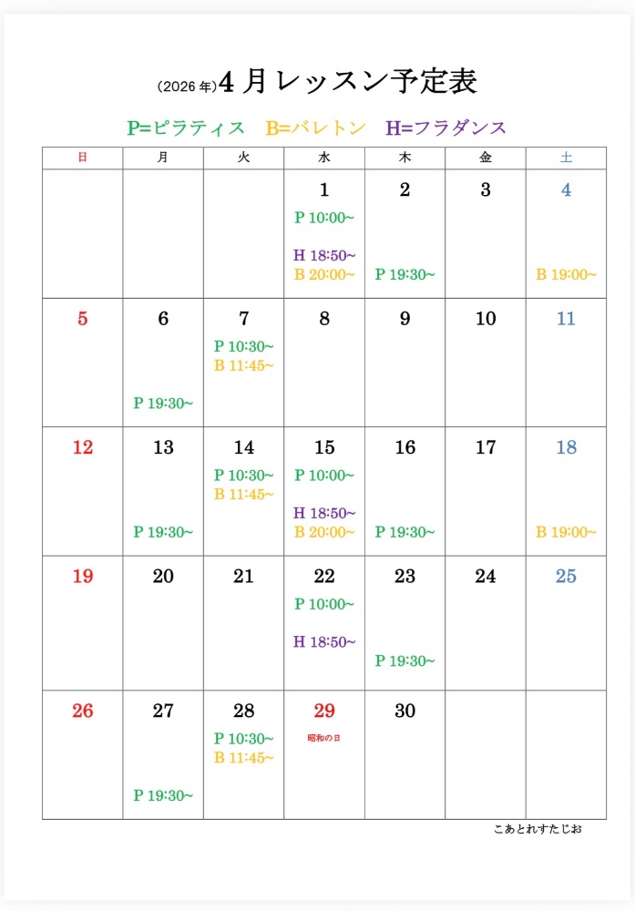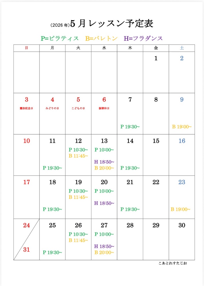 ↓カレンダーは会員様向け開講中グループレッスン予定表です